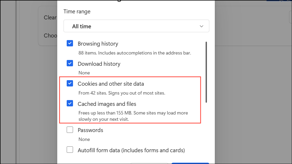 Step 2: Set the time range to All time, check Cookies and other site data and Cached images and files, then click Clear now.