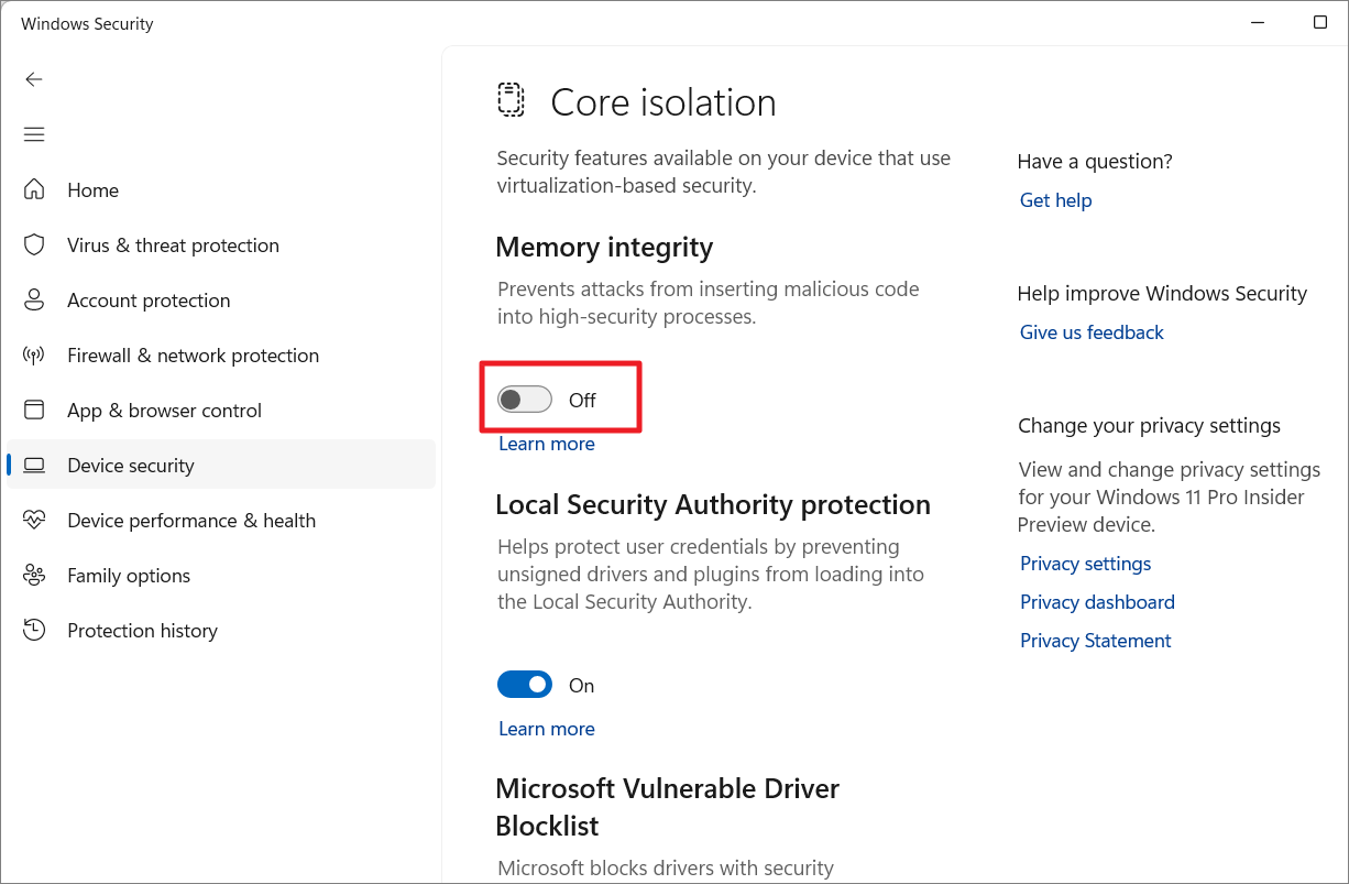 2. Turn off Memory Integrity temporarily