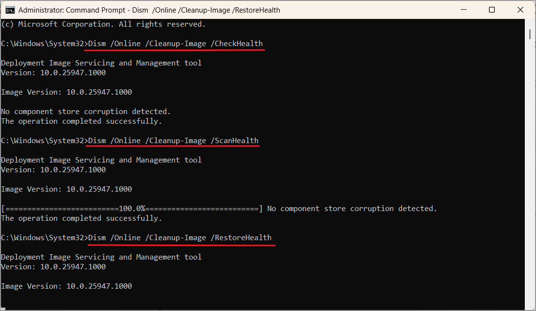 Step 3: To run a DISM scan, open Command Prompt as administrator again and enter these commands one by one, pressing Enter after each: