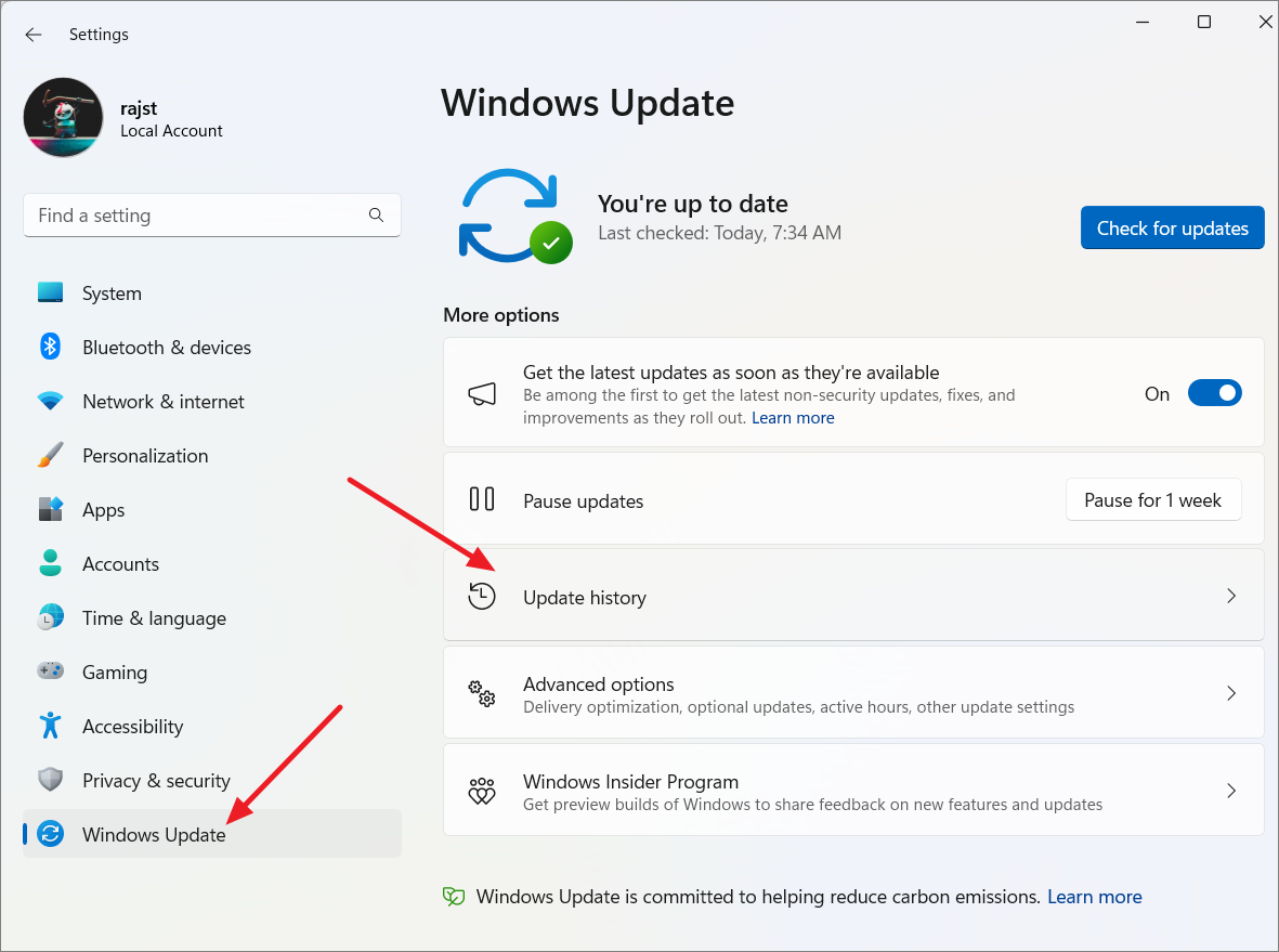 Step 1: Open Windows Settings by pressing Windows+I, then click on 'Windows Update' in the left sidebar. On the right, select 'Update history'.