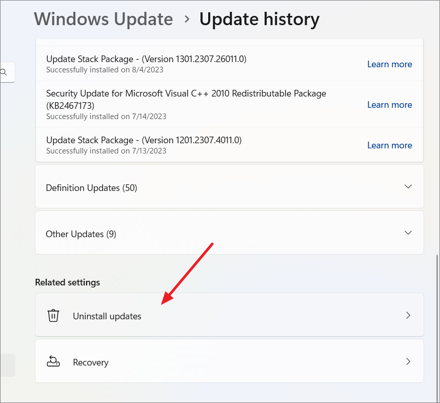 Step 2: Scroll down to the 'Related settings' section and click on 'Uninstall updates'.