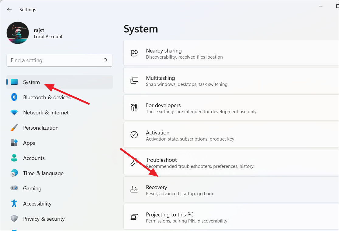 Step 1: Open Windows Settings, scroll down the 'System' tab, and select 'Recovery'.