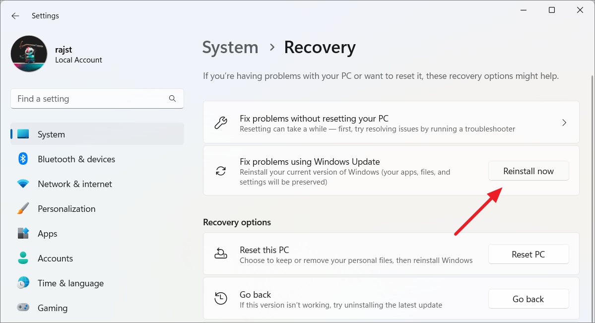 Step 2: On the Recovery settings page, click the 'Reinstall now' button next to 'Fix problems using Windows Update'.