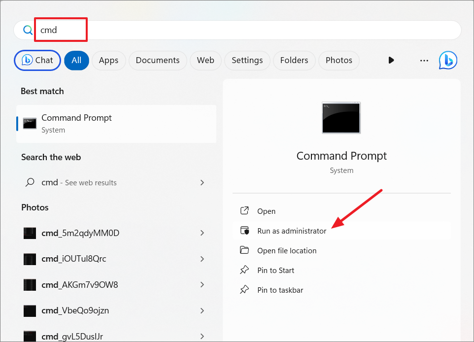 Step 1: Open Command Prompt as an administrator. Type cmd in the Start menu, right-click on 'Command Prompt', and select 'Run as administrator'.
