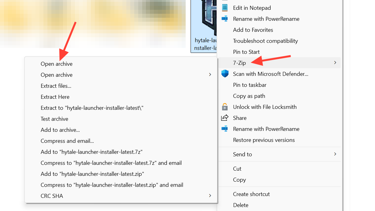 Step 2: Right-click the Hytale installer executable and choose Show more options, then 7-Zip, then Open archive.
