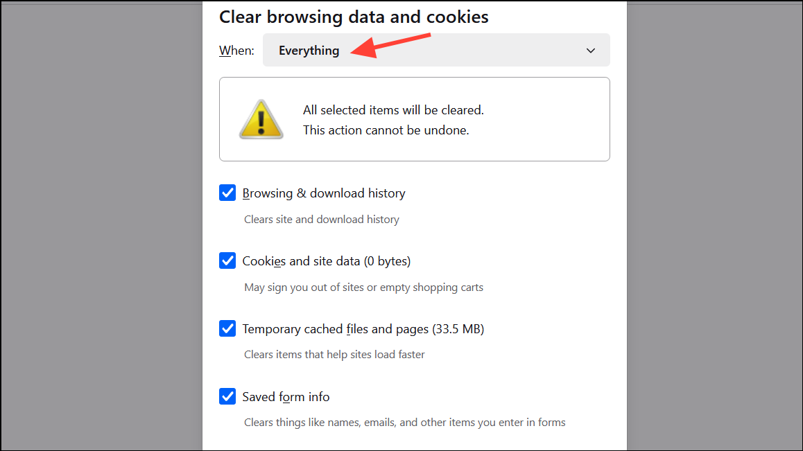 Step 3: In the Time range to clear dropdown, select Everything to remove all cached data.