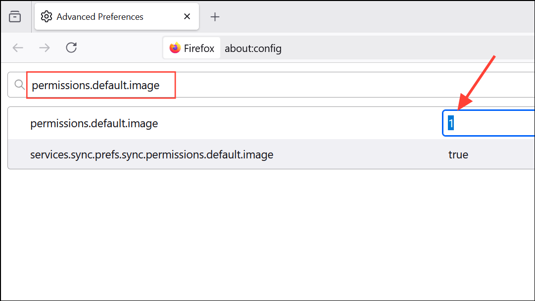Step 2: Search for permissions.default.image. The value should be 1 (allow all images). If set to 2 (block all images) or 3 (block third-party images), reset it to 1 by clicking the reset arrow.