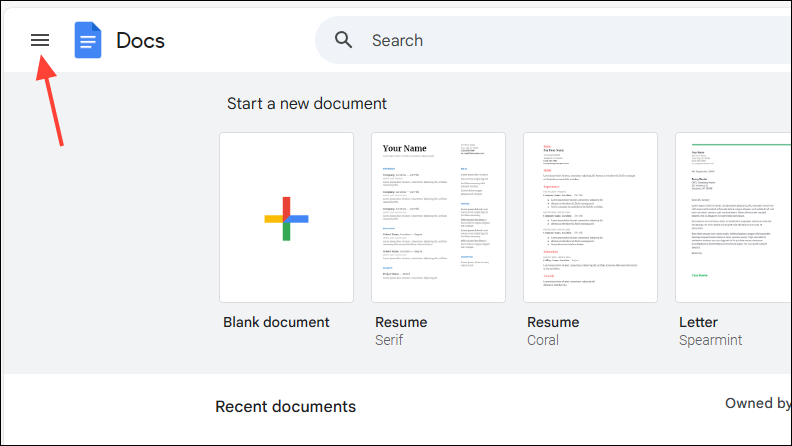 - Go to your Google Docs or Sheets homepage and click on the hamburger icon that appears as three horizontal lines on the top left.