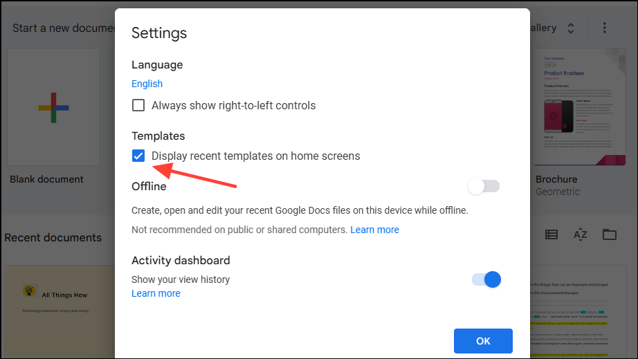 - Make sure that the 'Display recent templates on home screens' option is checked. If it isn't, click on it to enable it before clicking on the 'OK' button. Now, you should be able to see your templates on the home screen.