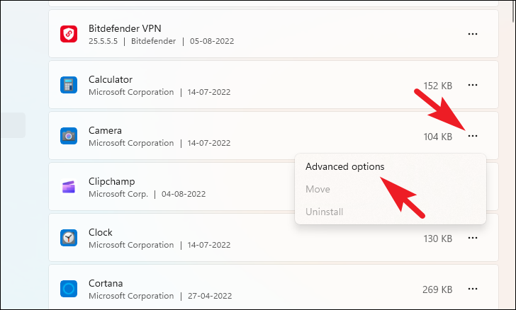 Step 4: Click on the three-dot icon (ellipsis) next to Camera and select Advanced options.