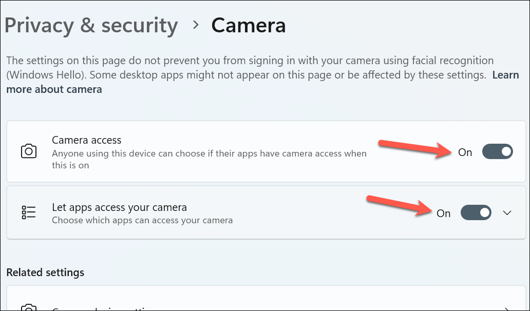 Windows 11 includes privacy settings that can restrict apps from accessing your camera. If your camera isn't working in specific apps or at all, these settings might be the culprit.