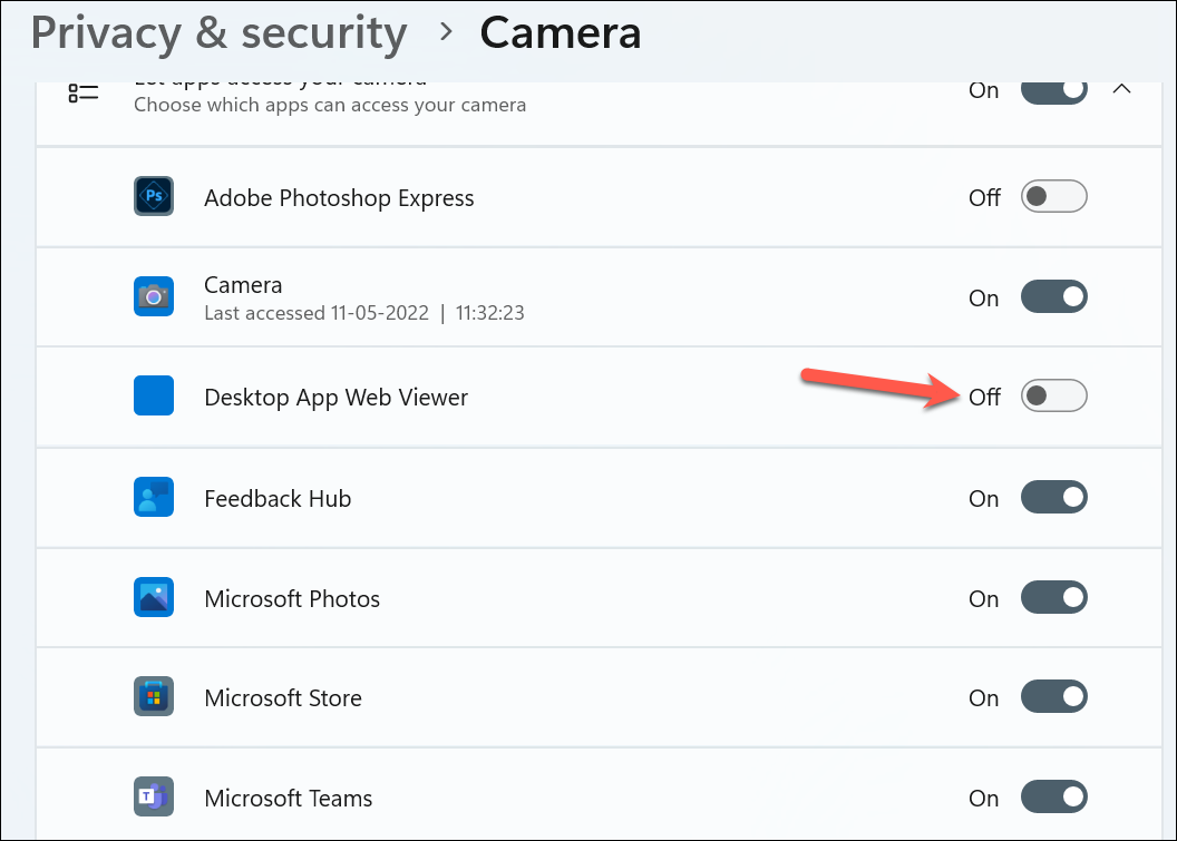 Step 5: Also, make sure that the option for Let apps access your camera is enabled. Then, scroll down and verify that the individual apps you want to use the camera with have permission. Toggle on the switch next to any app where you're experiencing issues.