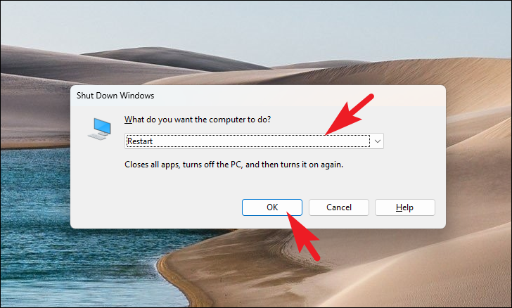 Alternatively, you can press Alt + F4 on your desktop to bring up the shutdown dialog, then select Restart and click OK.