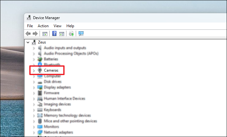 Step 2: In Device Manager, find and expand the Cameras section.
