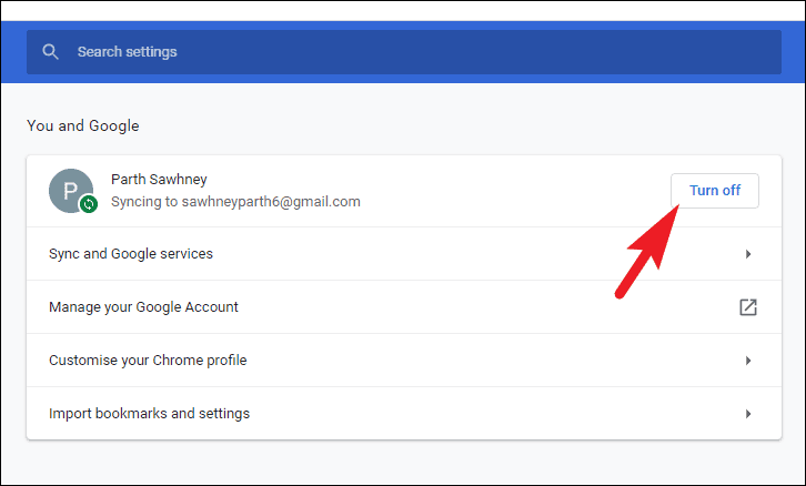 Now, from the right section of the screen, locate and click on the ‘Turn off’ button following your email address. This will sign you out from Chrome along with stopping the sync for your history, bookmarks, and passwords.
