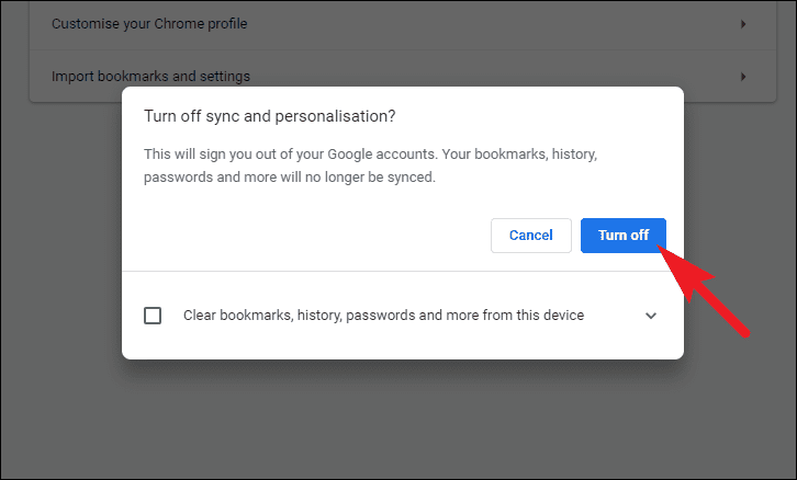 Finally, from the prompt on your screen, click on the checkbox preceding the ‘Clear bookmarks, history, passwords, and more from this device and then click on the ‘Turn off’ button to delete everything temporarily and sign out.