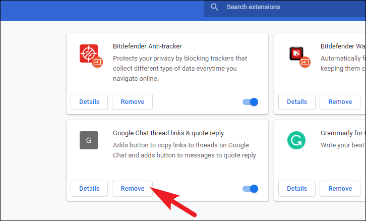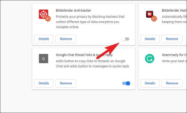 Now, disable all of the extensions by clicking on individual switches present on each extension tile to the ‘Off’ position.