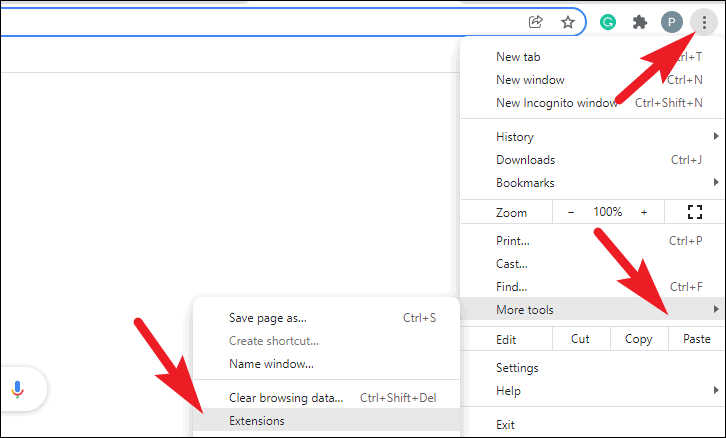 To disable all the extensions, from the Chrome home page, click on the kebab menu icon (three vertical dots). After that, hover over the ‘More tools’ option from the expanded list and select the ‘Extensions’ option.