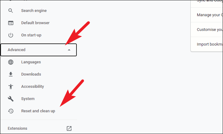 Then, click on the ‘Advanced’ tab from the left sidebar present on the Settings page to expand the list, and next, click on the ‘Reset and cleanup’ option.