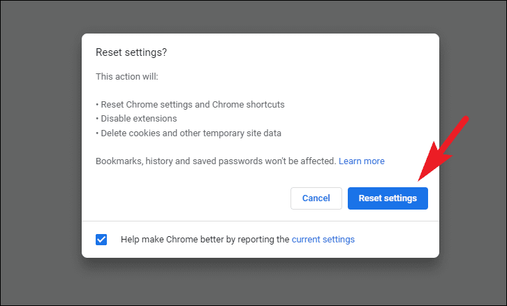 From the overlay pane, click on the ‘Reset Settings’ button to reset Chrome.