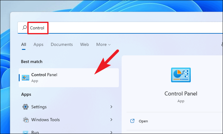 To do so, open the Start Menu and type Control Panel to search for it. Then, from the results, click on the ‘Control Panel’ tile to open it.