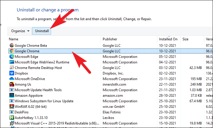 Once the list has been populated, locate and click to select ‘Google Chrome’ and then click on the ‘Uninstall’ button to initiate the uninstall process.