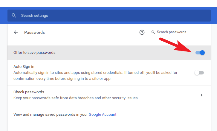 Now, on the next screen, make sure the switch following the ‘Offer to save passwords’ option is in the ‘On’ position.