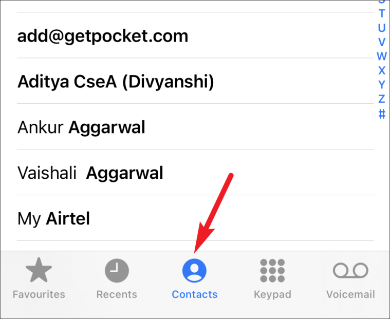 Now, delete the contact for the other person from your phone. Open the Phone app and tap the ‘Contacts’ tab from the bottom of the screen.