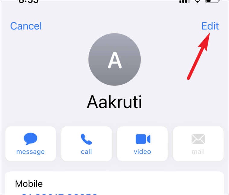 Then, find and open the contact details for the other person. From the contact details, first, copy the contact information and save it somewhere else or screenshot them in case you don’t remember them. Now, tap the ‘Edit’ option in the top-right corner.