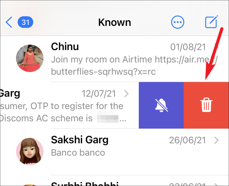 To delete the chat, place your finger at the right corner of the chat thread from the lists of chats and swipe towards the left. The option for ‘Delete’ will appear. Tap it to delete the chat.