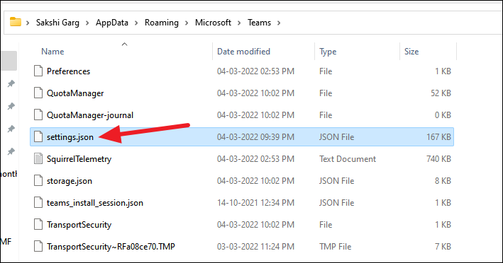 In the Teams folder, locate the settings.json file. Before deleting it, copy it to your desktop or some other location to create a backup just in case you end up needing it. Then, delete the file.