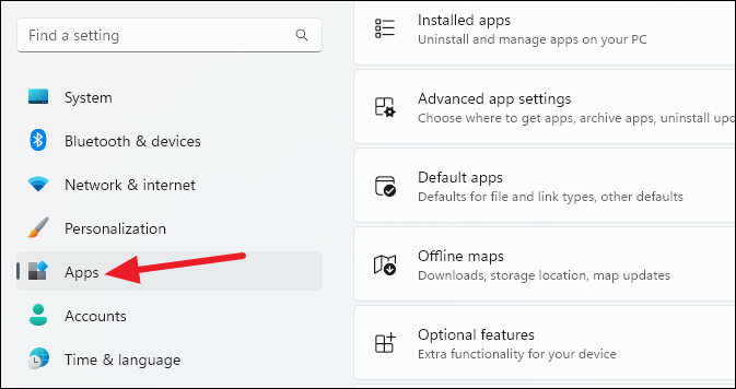 To uninstall the app, open the Settings on your Windows computer. Then, go to ‘Apps’ from the navigation menu on the left.