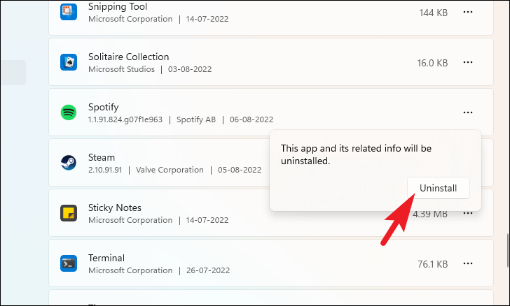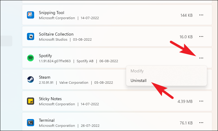 Step 4: Locate the Spotify app in the list of installed apps. Click on the three-dot menu icon next to it and choose Uninstall.