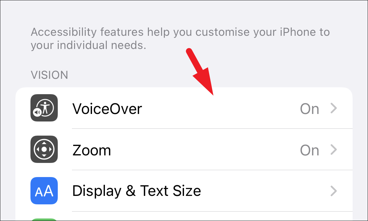 After that, under the ‘Vision’ section, locate and tap on the ‘VoiceOver’ option to continue.