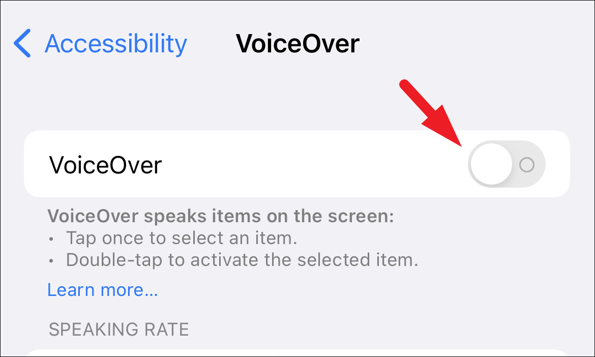 Then, locate the ‘VoieOver’ tile on the screen and if the following toggle switch on the tile is in the ‘On’ position, tap on it to bring it to the ‘Off’ position.