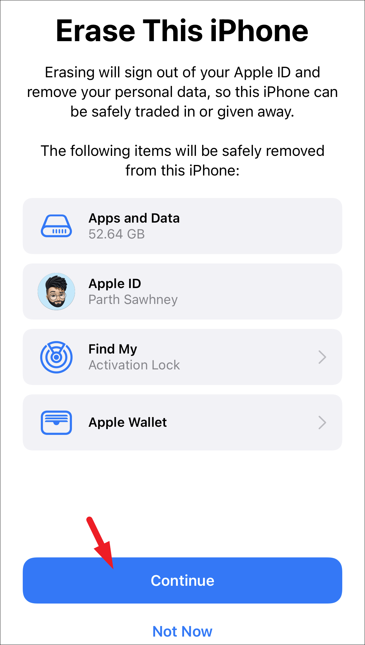 On the next screen, tap on the ‘Continue’ button present at the bottom section of the screen to proceed. You will be next asked to enter the passcode for your iPhone.