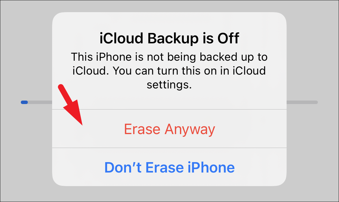 Once you have entered your passcode, your iPhone will be now backed up to iCloud. In case your iCloud backup is off, tap on the ‘Erase Anyway’ button to erase all data currently present on your iPhone and bring it to a factory default state.