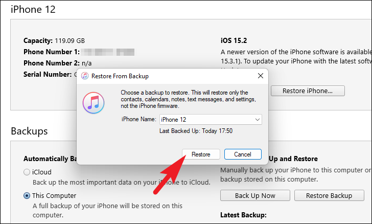 Now, on the overlay window, click on the drop-down menu following the ‘Backup’ option and click to select the most recent backup from the list. After that, click on the ‘Restore’ button present in the window. If the backup you wish to restore your iPhone from is encrypted, you may also need to provide the password for it as well.