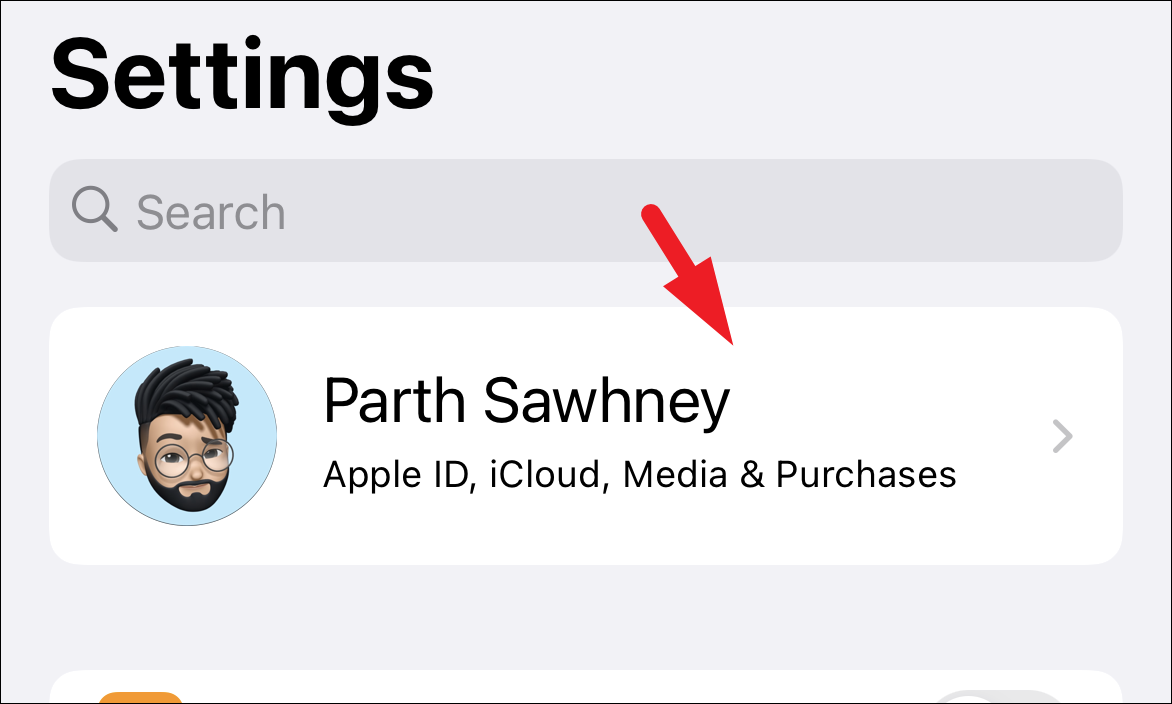 Next, on the Settings screen, tap on the Apple ID card to continue.