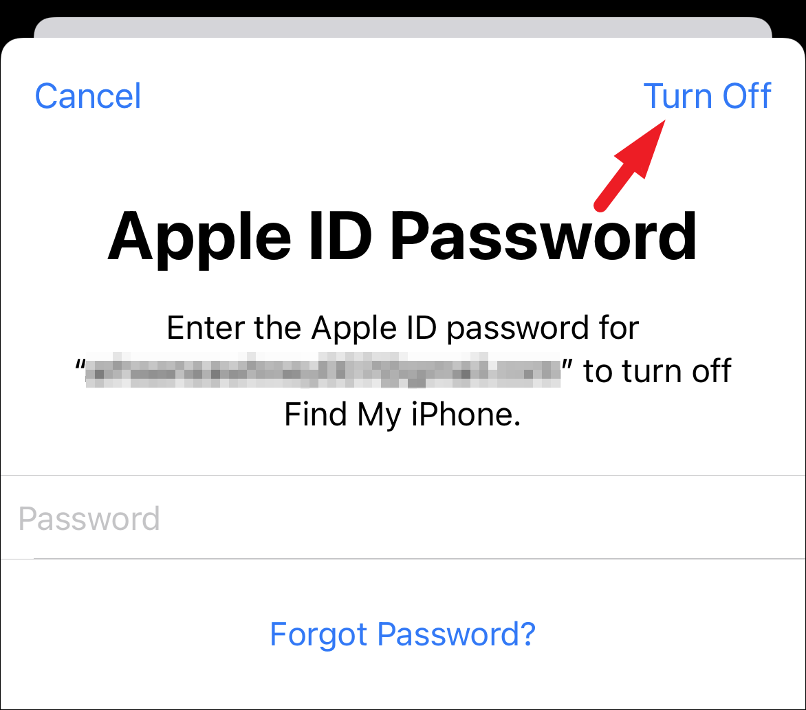 Next, enter the password for your Apple ID and tap on the ‘Turn Off’ option present on the top right corner of your screen to turn off the ‘Find My’ services for your iPhone.