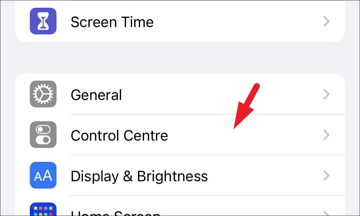 Then, from the Settings screen, locate and tap on the ‘Control Centre’ option to continue.