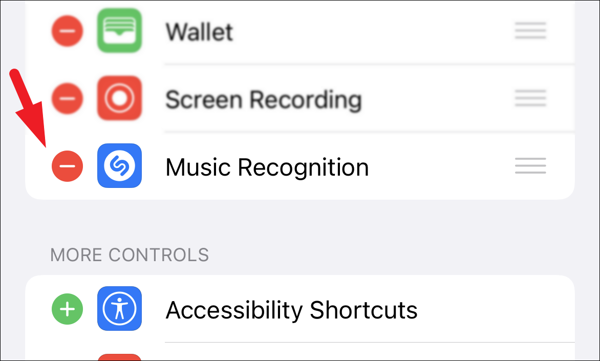 Now, head to the ‘Included Controls’ section on the ‘Control Centre’ screen. Then, tap on the ‘red dot’ preceding any third-party app control present in the list to reveal a ‘Remove’ button.