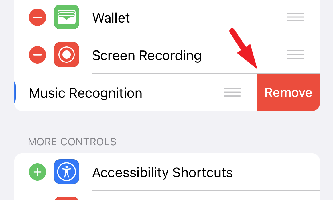 Then, tap on the ‘Remove’ button revealed on the right edge of the option to remove the app control from the ‘Control Centre’. Repeat the process for every third-party app present in the list.