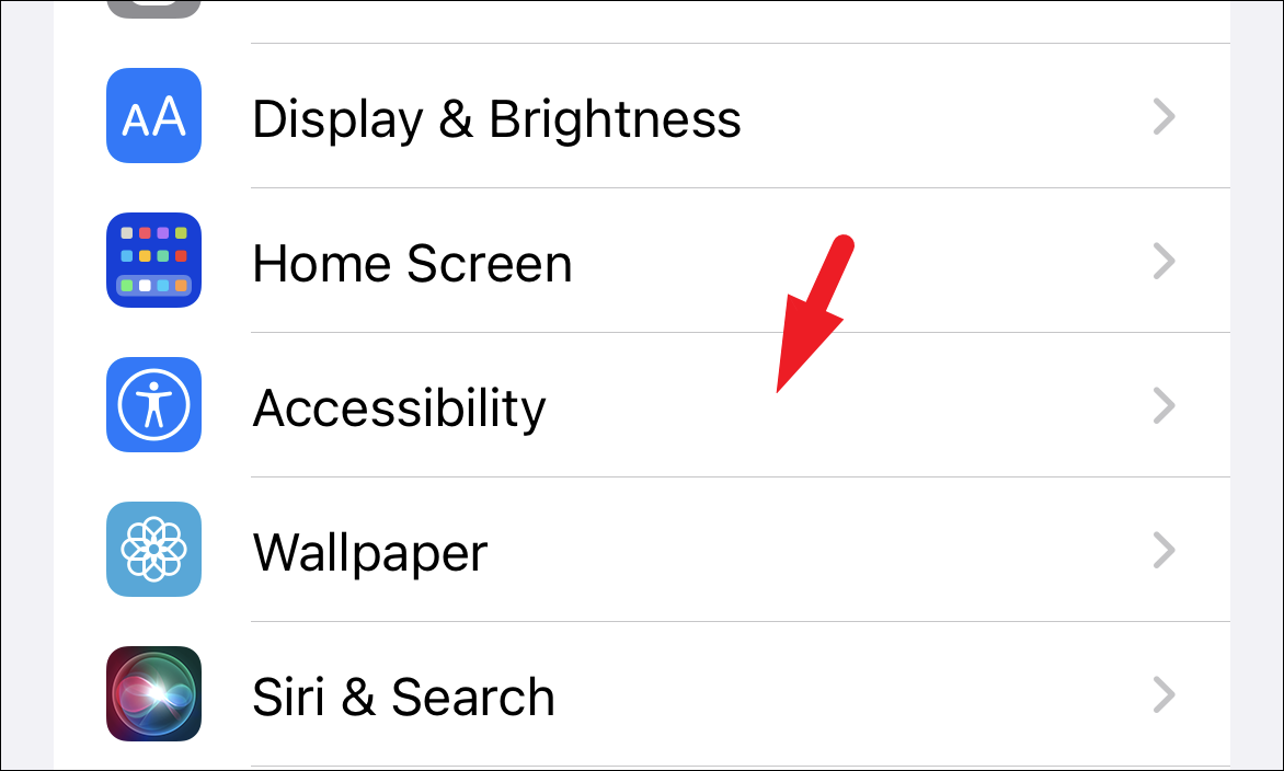 Next, on the Settings screen, scroll down to locate and tap on the ‘Accessibility’ option from the list to proceed.