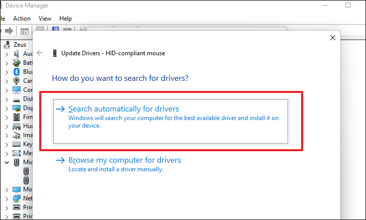 After that, from the separately opened window, press the Enter key to select the ‘Search automatically for drivers’ option. In case the focus cursor is not on the option, press Tab to move to the next option in the window or Shift + Tab to move to the previous option.