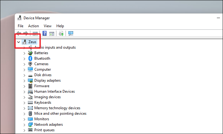 In the Device Manager window, first, press Tab to bring focus to the list of component categories present on the window.