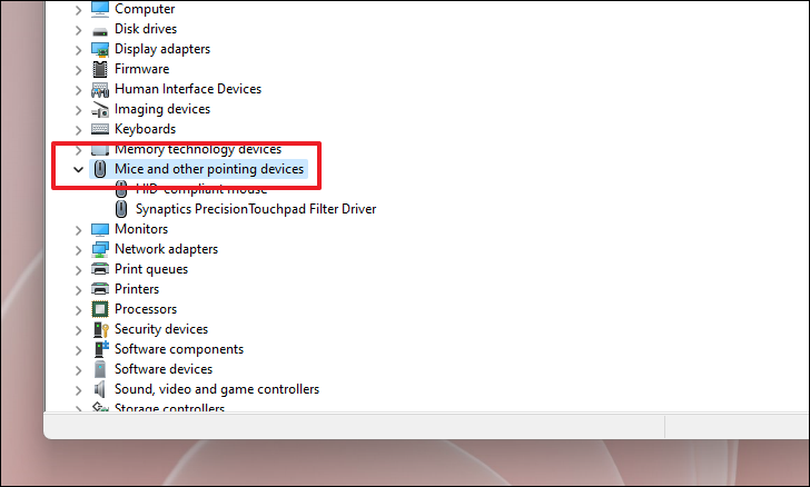 Then, press and hold the Down Arrow key till you reach the ‘Mice and other pointing devices’ option, now, press the Side Arrow key to expand the section.