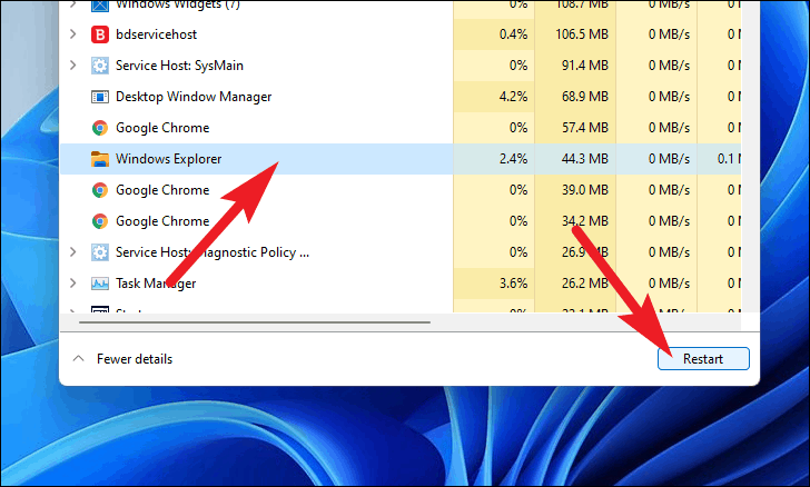 - Click on the Restart button at the bottom right corner of the Task Manager to restart the explorer.