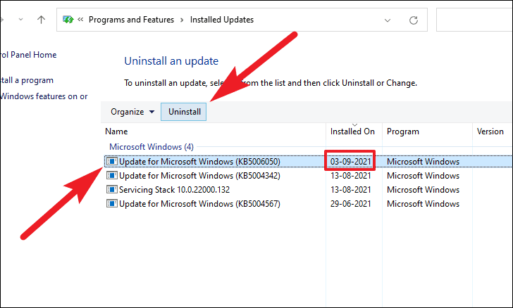 - In the Control Panel window, find the most recent update from the list.