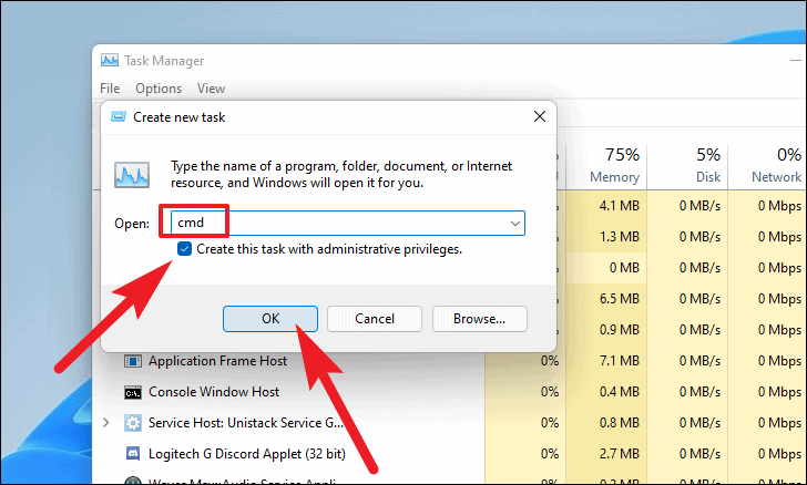 cmdin the text box. - Check the box next to Create this task with administrative privileges.